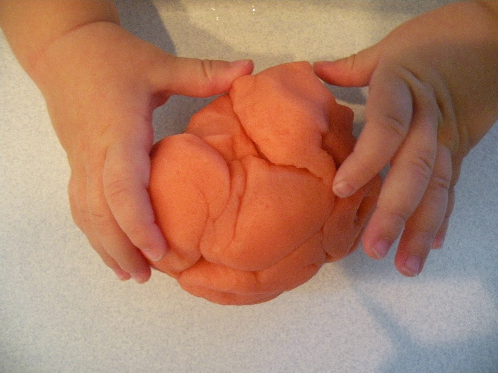 I watched her cook it in a pot on the stove, then dump it out on the counter and add food coloring to it, kneading and working it in until the play dough had turned from white to a vibrant color.